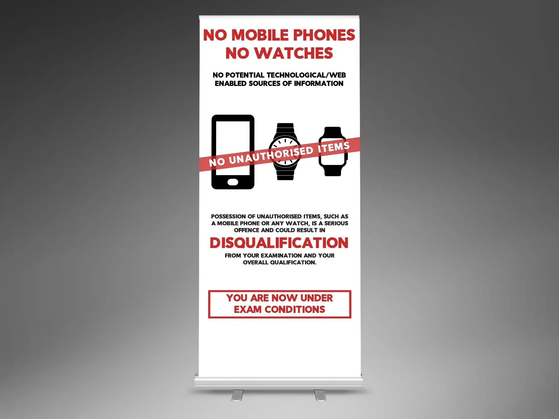 Don’t let students say they didn’t see the JCQ signs. Place our Unauthorised Items Pull-Up Banner at the entrances to your exam hall and at two meters tall they have no excuses! This banner has the JCQ wording on it and has been reproduced with their permission.